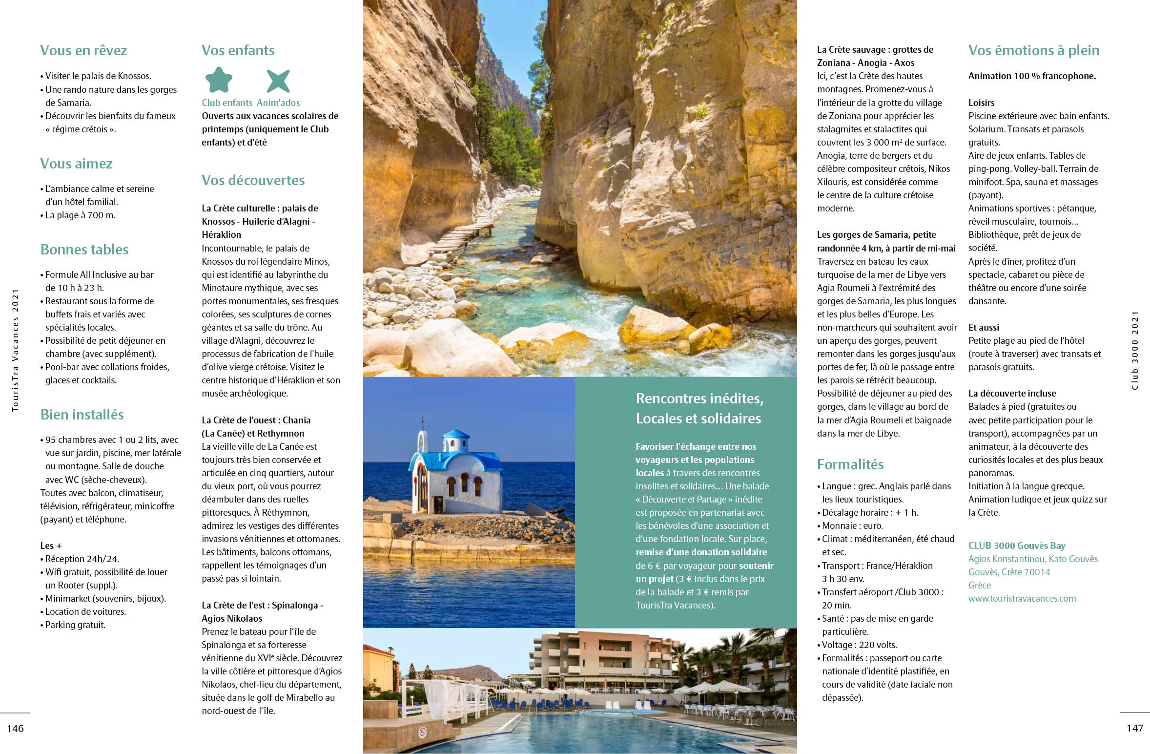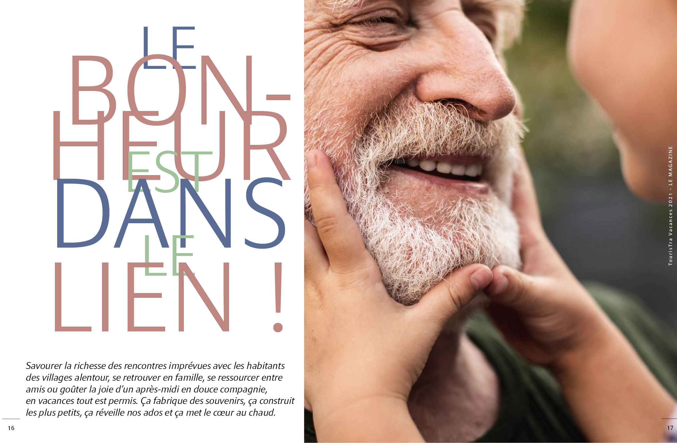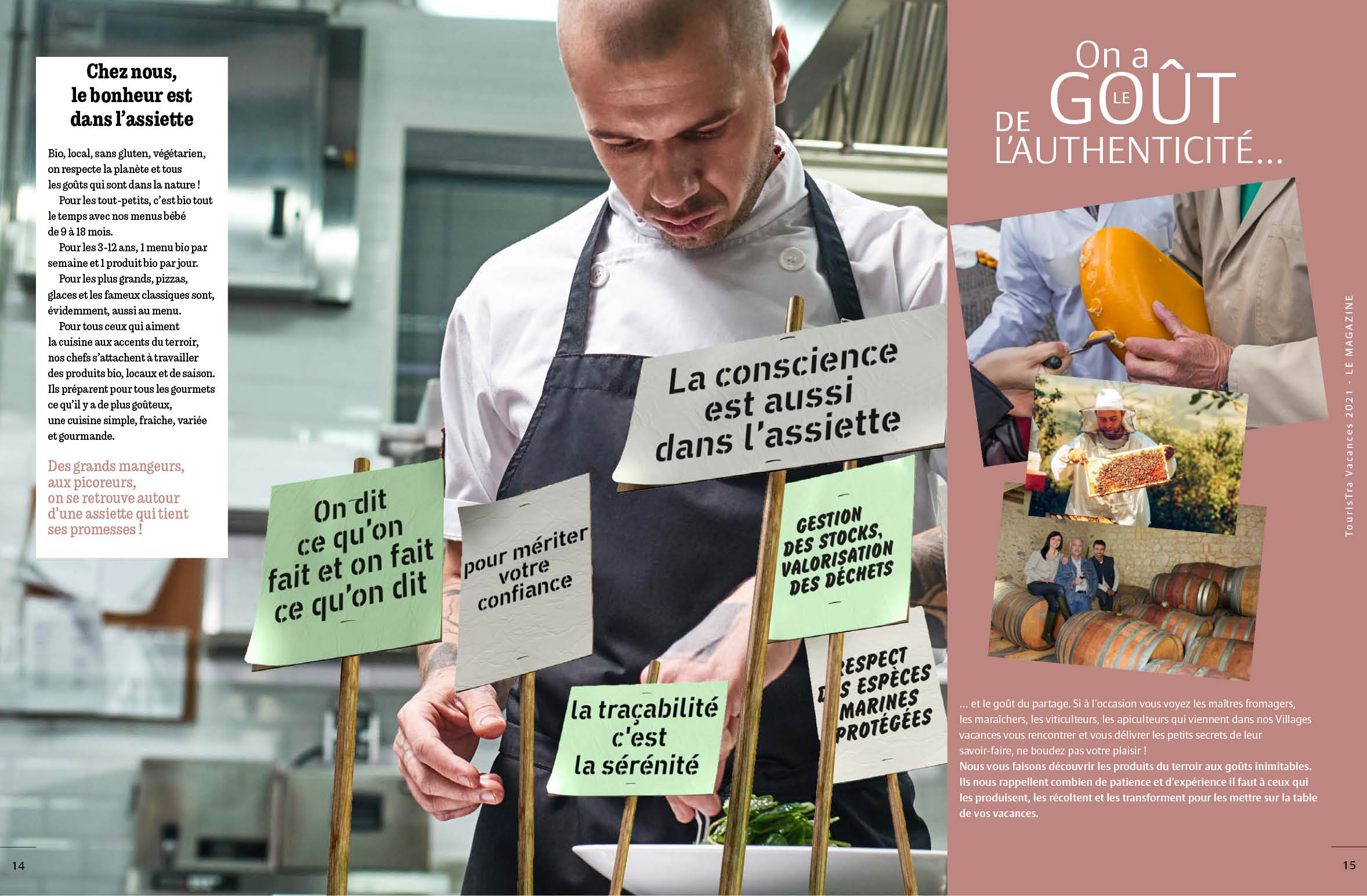 Sur la partie magazine, notre équipe a créé une formule engageante, tissant le lien avec le lecteur et faisant l’inventaire des bonheurs de partir. Des photos pleines pages sobres et dépouillées, des portraits serrés, des tons doux confortés par un rédactionnel qui convoque l’émotion. La présentation des séjours sur 4 pages permet au lecteur d’appréhender pleinement chaque offre. Une double page d’entrée porte sur la région, l’authenticité du terroir, la culture et met en exergue les qualités du site. La double page suivante, accompagne le lecteur dans ses choix : « vous en rêvez, vos émotions à plein … ». Une adresse directe et une tonalité empathique confortant la proximité de Touristra Vacances et des vacanciers qui lui font confiance.