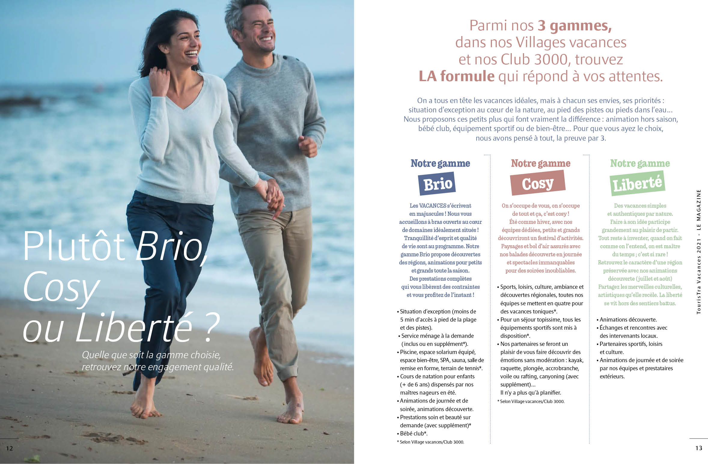 L’agence a travaillé en collaboration avec la direction marketing de Touristra pour le contenu des gammes et le nom de chacune d’elles : brio, cosy et liberté. Ces trois nouvelles gammes de vacances répondent aux attentes et aux besoins de typologies toujours plus diverses de vacanciers.